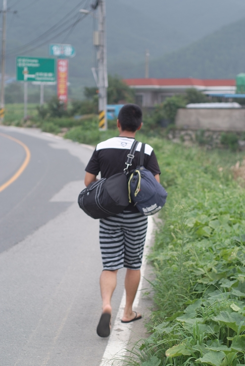시장에서 산 바지와 슬리퍼를 신고 묵묵히 걸어가는 친구님과, 유난히 머리가 작아보이는 저입니다.