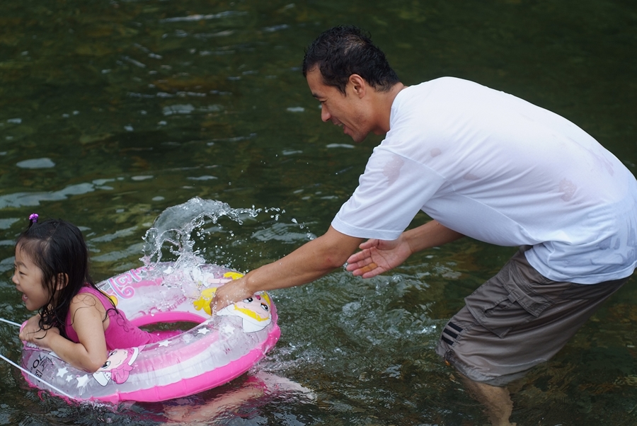 아침을 적당히 먹은 후, 바로 앞 계곡에 몸을 담급니다.