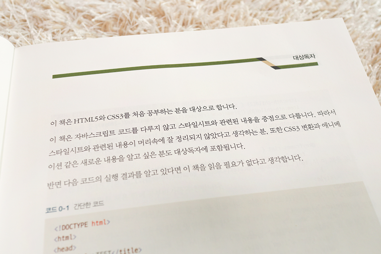 첫번째 파트에서는 HTML5 태그와 CSS3 선택자, 스타일 기본 속성 하나 하나를 백과사전처럼 세세하게 다뤄주고 있다.