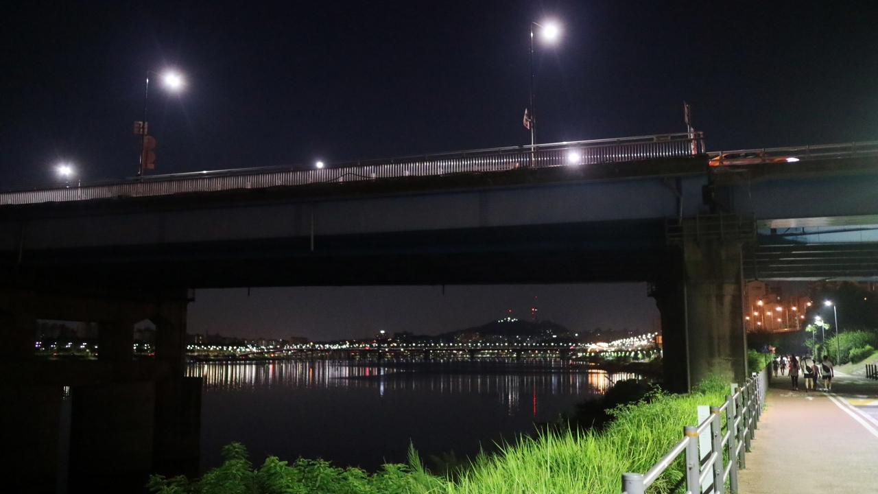 올림픽대로 아랫길을 따라 한참 가는데 여기가 꽤 어둡고 물비릿내가 심하다. 루멘 높은 플래시를 반짝이며 달려오는 자전거도 꽤 많고. 사람 한명이 걸으면 편하고, 두명이 걸으면 좀 많이 좁은 보행자길과 자전거 한대 지나갈 정도의 자전거 길이 같이 가는 길. 한강대교를 지나가면 보행자는 강 바로 옆길로, 자전거는 윗길로 다니기 때문에 꽤 편안하게 걸을 수 있다.