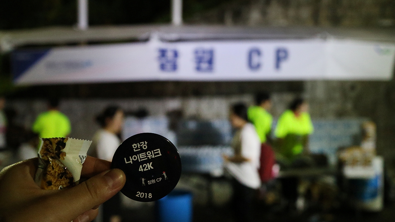 여기서부터 반포대교까지 거의 강변북로 아랫길을 걸어 가는 코스인데, 그 길이 그 길 같고 커브를 돌면 또 똑같은 그 길이고. 앞 뒷사람 간격이 많이 벌어지는 구간이다. (작년에 걸을 때에는 꽤 후발대라 사람 자체가 거의 없었다고..) 그래서 이 길이 내가 가는 길이 맞나, 왜 걷기대회 표식은 잘 없는가. 할때 쯤, 반표대교를 지나면 마지막 뺏지를 나눠준다.