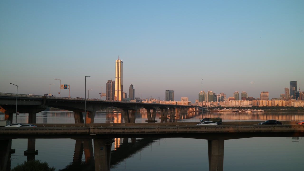 이런저런 이야기를 하며 걷다가, 말 없이 걷다가 원효대교를 건너기 전에 해가 떠 버렸다. 길다면 긴 원효대교는 1.5km정도 된다. 이 다리는 사람 둘정도 걸을 수 있는 공간이 차가 지나다니는 곳 바로 옆에 있어 조금 위험한 다리. 하지만 해는 떠오르고! 마지막 골인지점이 눈 앞에 보이기에 제일 힘차게 걸을 수 있는 곳이었다.
