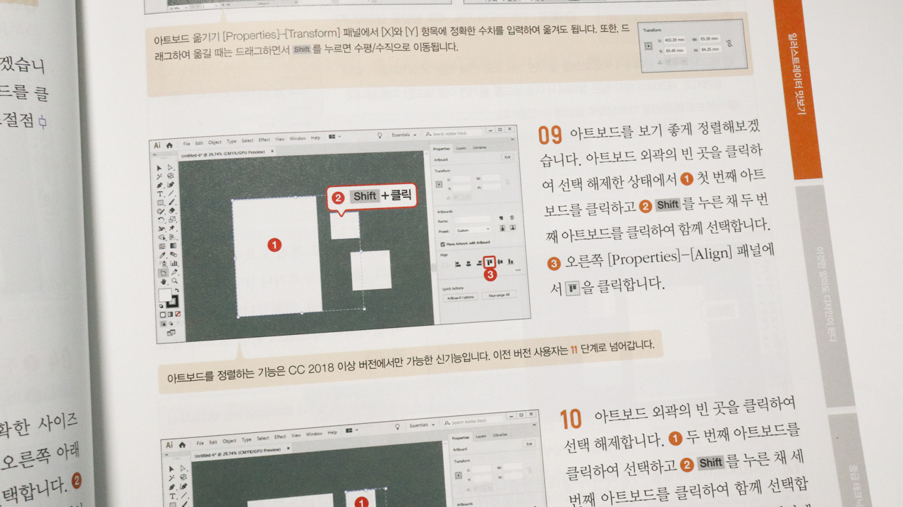 책을 보다보니 정기적인 프로그램 업데이트가 되면서 새롭게 나온 신기능을 만나볼 수 있었는데 - 약간의 배경 강조를 통해 안내되고 있다.여기서 아트보드를 정렬하는 기능을 발견 ! 작업하면서 쓸데없이 1px에 집착하기에- 정말 필요했던 기능이었는데 CC 2018부터 가능한 신기능이라고 안내되고 있다.ㅜ 사무실 CC 도입이 시급합니다.
