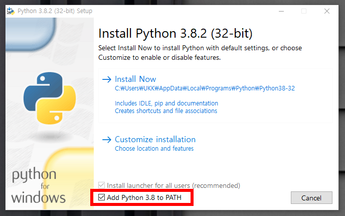 2) PATH 자동등록 체크 후 install Now 하면 편함.
