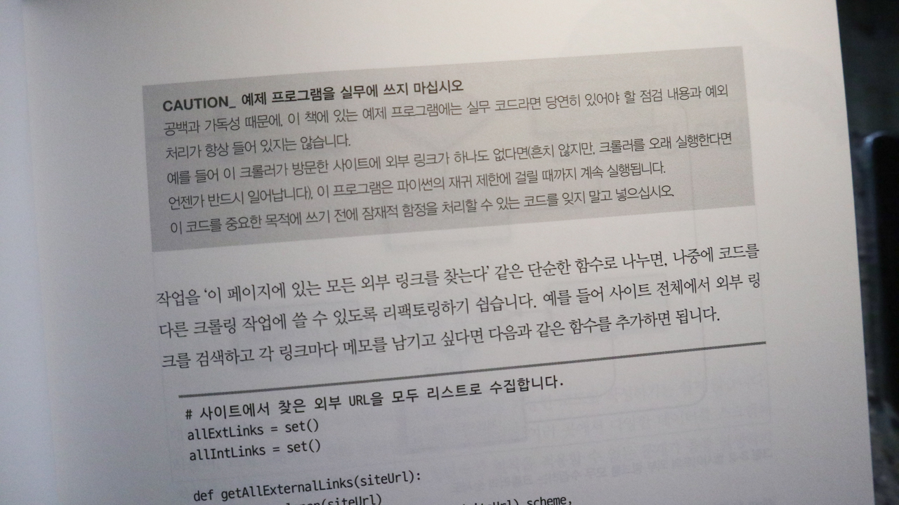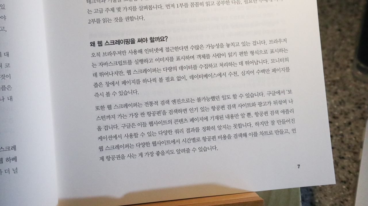웹크롤러는 URL에서 페이지를 가져오고, 페이지를 검사해 다른 URL을 찾고, 다시 그 페이지를 가져오는 작업을 무한히 반복한다. 웹크롤러로 웹의 방대한 자료를 필터링 없이 수집하게 되면 그에 따른 문제가 많이 발생한다. 이 책에서는 원하는 범위에서 원하는 데이터만을 가져오고 DB로 만드는 방법을 친절하게 설명해준다.