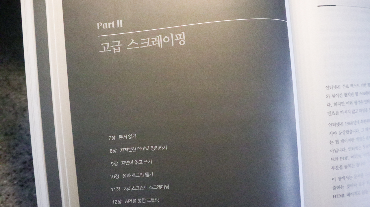 Part1에서는 다양한 라이브러리를 이용한 웹크롤러 만들기, API수집, 데이터를 DB로 저장, PDF·word파일 분석방법과 같은 웹크롤링 기초를 다루며 Part2에서는 데이터 정리, 자연어분석, 폼.로그인 뚫기 이미지 처리, 스크레이핑 함정 피하기 등의 고급 기법을 다루고 있다.
