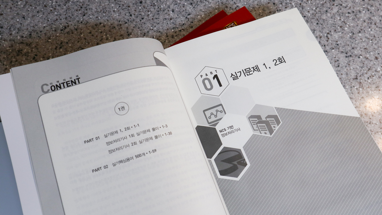 제일 얇은 1권에서는 기사 1,2회 실기문제 풀이와 실기 핵심용어 500개가 담겨져 있다.