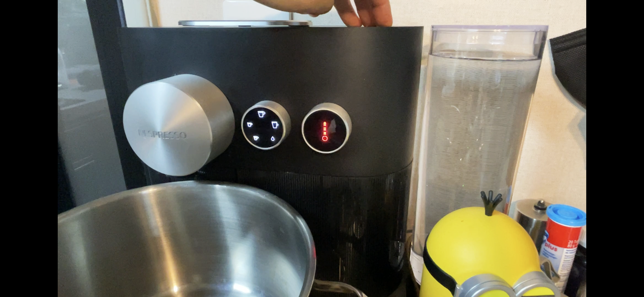 7. 두번째 채운 물이 반쯤 사라지면 추출버튼 경고가 다시한번 들어오는데, 캡슐트레이를 열어 물을 비워주고