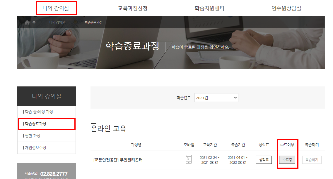 한국교통공단 사이버연수원 홈페이지 -> 나의강의실 -> 학습종료과정 -> 수료여부 아래 [수료증]을 누르면 인쇄가능하다. 프린터기가 없어도 PDF로 저장 가능하니 저장해두자. (크롬 가능)
