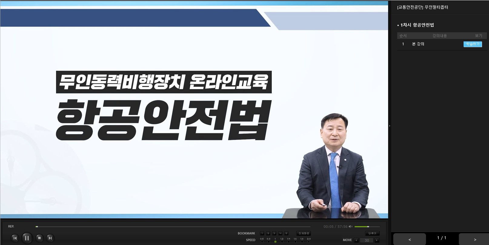 항공안전법 / 항공사업법 / 공역 및 항공안전 / 무인항공기 인적요인 / 무인비행장치 시스템 / 비행이론 / 항공기상 총 7강좌로 336분이다. (약 6시간 ㅜㅜ)