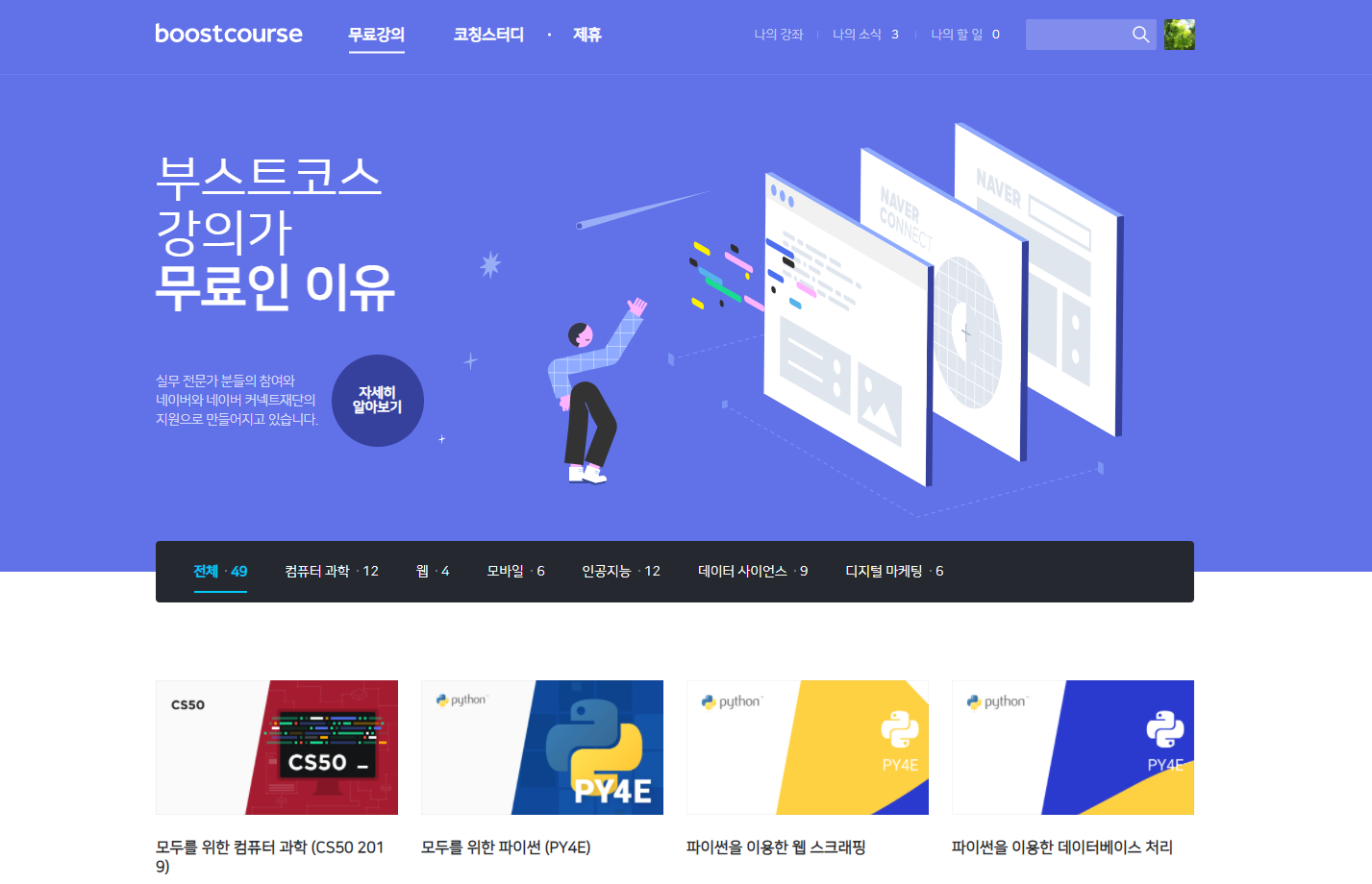 부스트코스(boostcourse)는 모두 함께 배우고 성장하는 비영리 SW 온라인 플랫폼입니다.