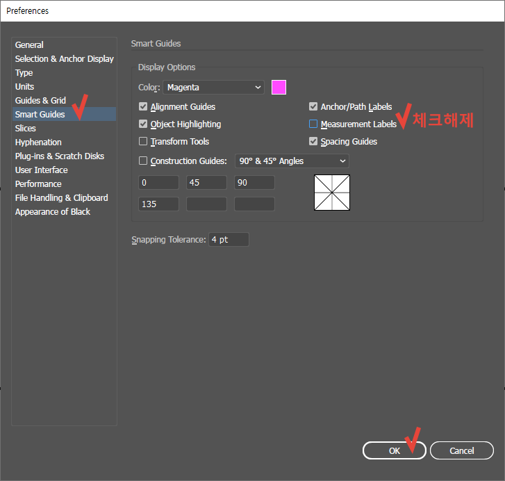 Edit → Preferences → Smart Guides... → Measurement Labels 체크해제