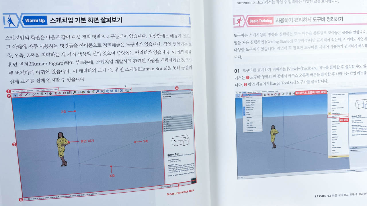 학부 시절에는 스케치업을 안쓰고 캐드-맥스를 썼었는데, 요즘 친구 일하는 것을 보니 스케치업을 많이 사용한다고 한다. 맥스는 가격이 비싸기도 하고.. 스케치업이 훨씬 쉽고 가볍고 저렴하기도 하고. 요즘은 웹툰 배경으로도 스케치업을 많이 사용한다고 하는데.. 아무튼 다시 스케치업을 손 댈 일이 생겨 책을 보게 되었다.