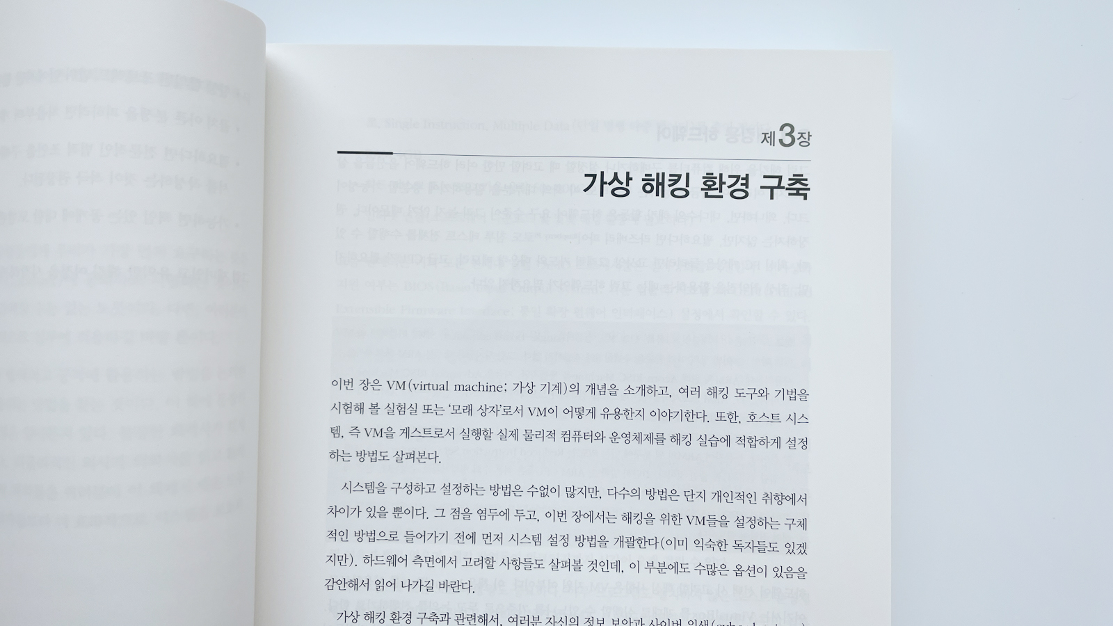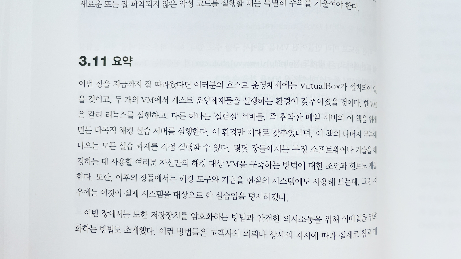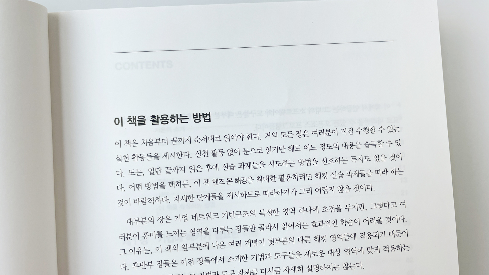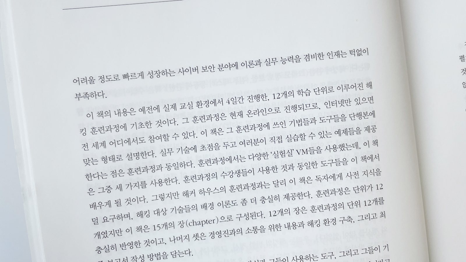 서문에 나온 내용을 보면, 이 책의 내용은 실제 강의환경에서 4일간 12개의 학습단위로 이루어진 해킹 훈련과정에 사용되었다고 한다. 그 훈련과정에 사용된 기법들과 도구들을 실무 기술에 맞춰 만들어진 책. VM을 이용해 모의 해킹 테스트를 직접 해 보며 해킹 사례들을 배워보는 책이다. 책은 처음부터 끝까지 순서대로 읽어나가면 된다.