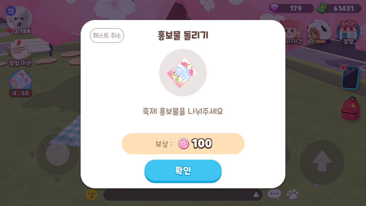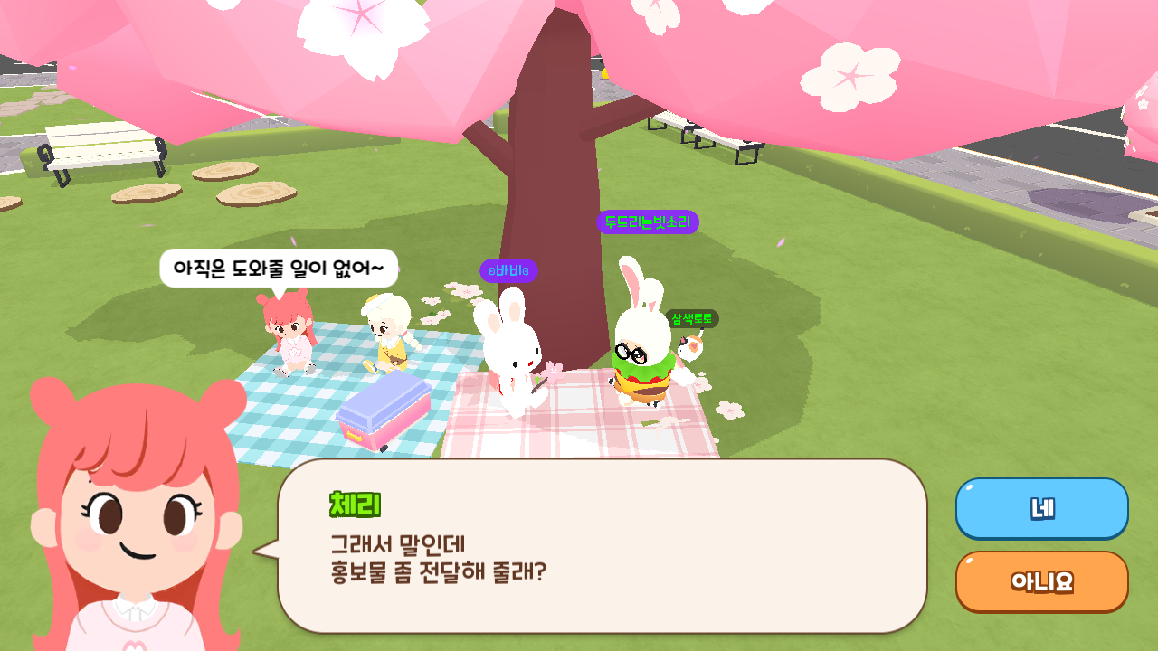 | 광장 체리의 부탁 | 붕어빵배달 / 홍보지전달/벚꽃잎줍기 | 100코인 x 3배 = 300 벚꽃코인 |