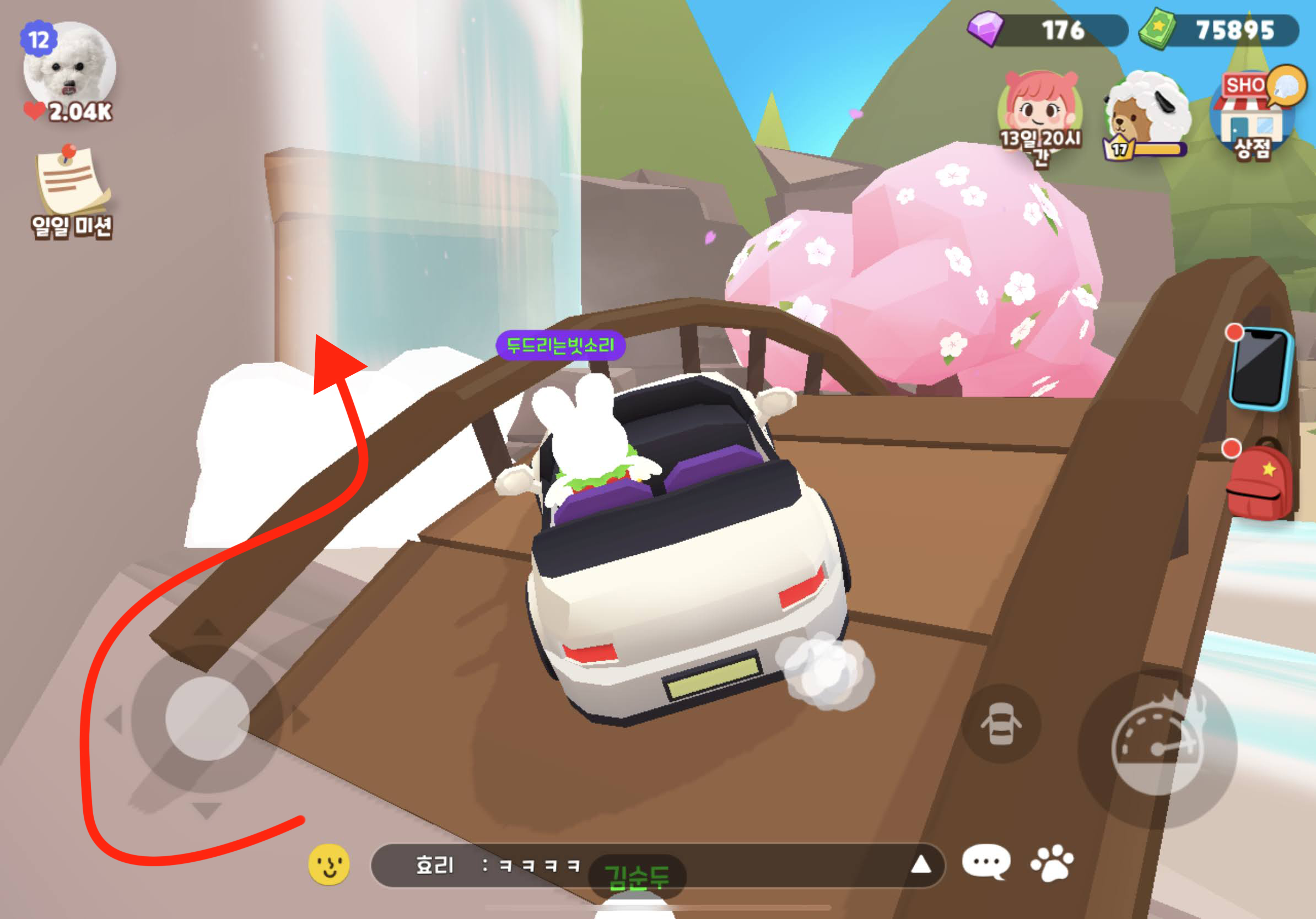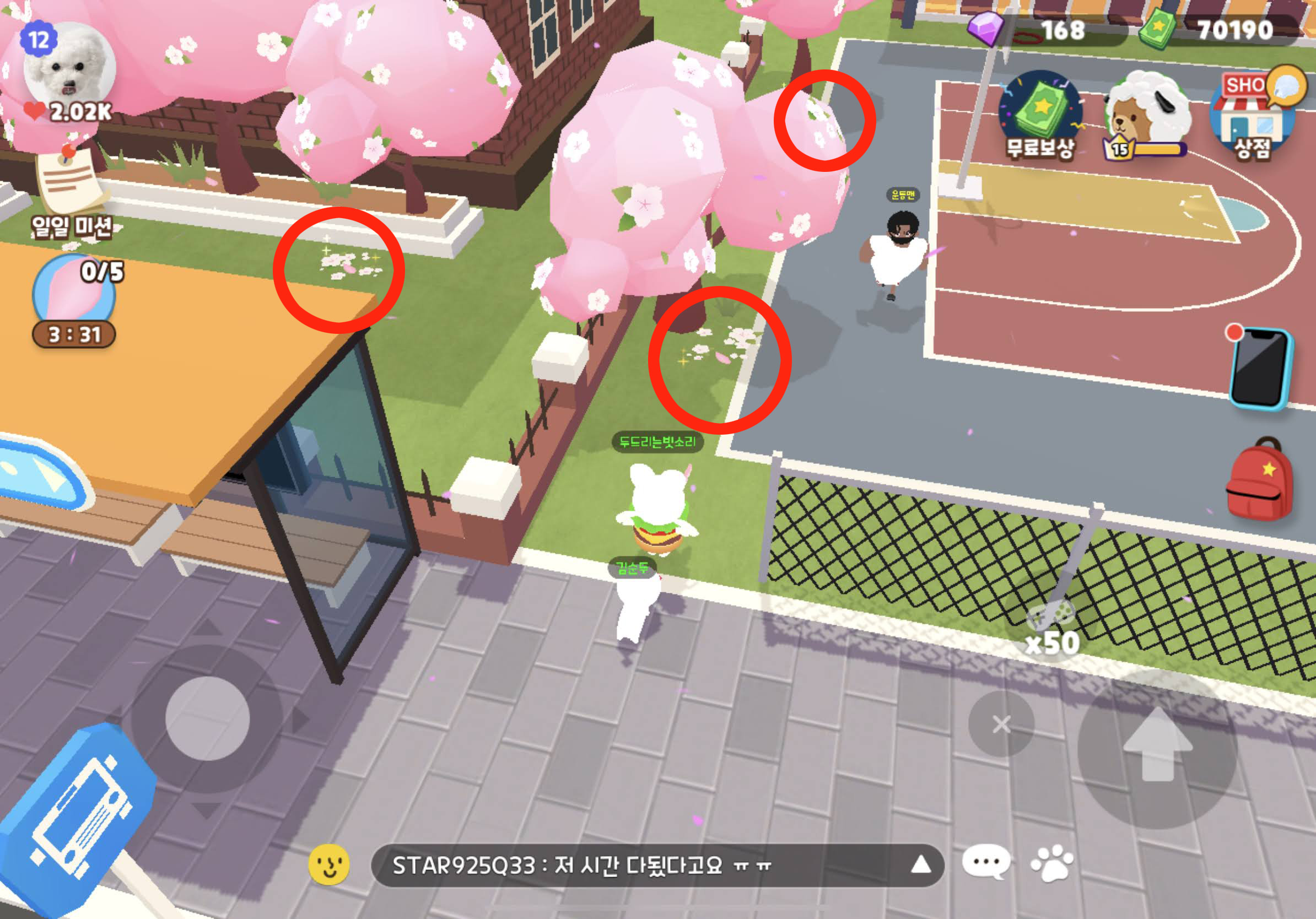 벚꽃잎은 나무 아래에 있으니 나무 많은곳 위주로 돌면 빠른 클리어 가능(학교쪽)