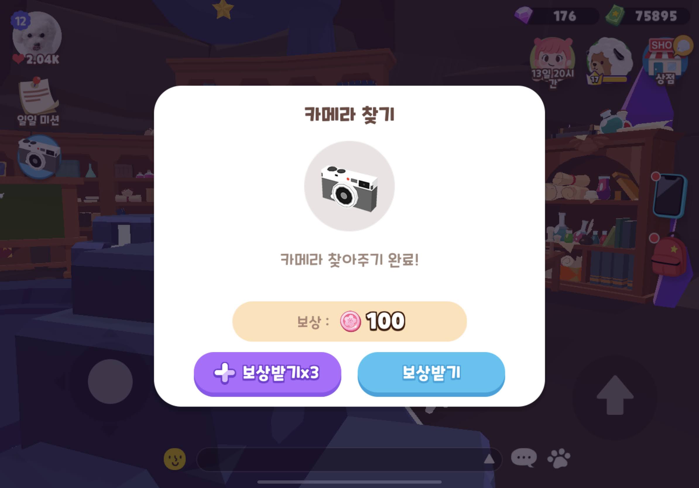 | 캠핑장 간달푸 아저씨의 | 잃어버린 카메라 찾아주기 | 100코인 x 3배 = 300 벚꽃코인 |