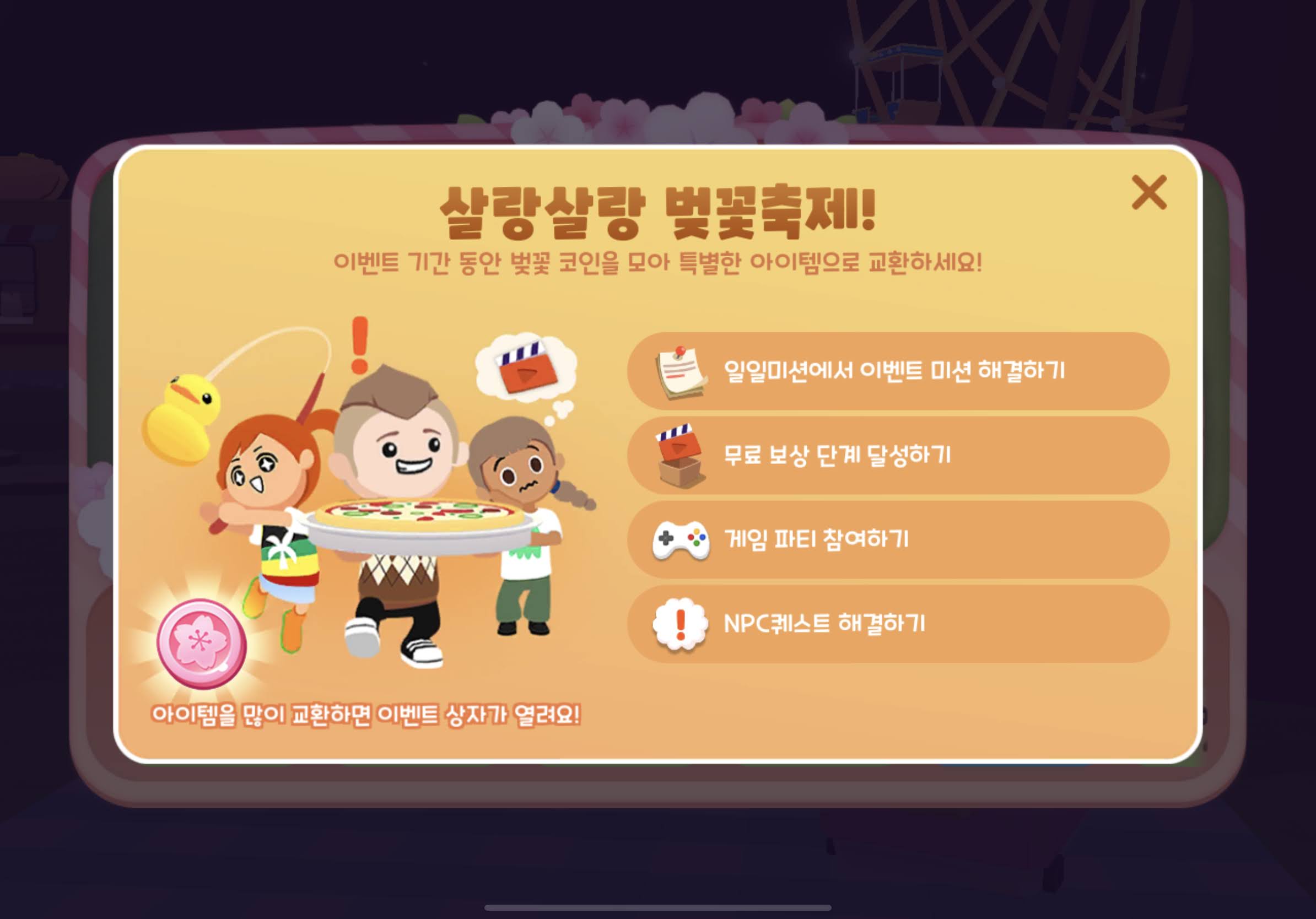 | 광장 핫도그맨 | 벚꽃 화전 전달하기 | 100코인 x 3배 = 300 벚꽃코인 |