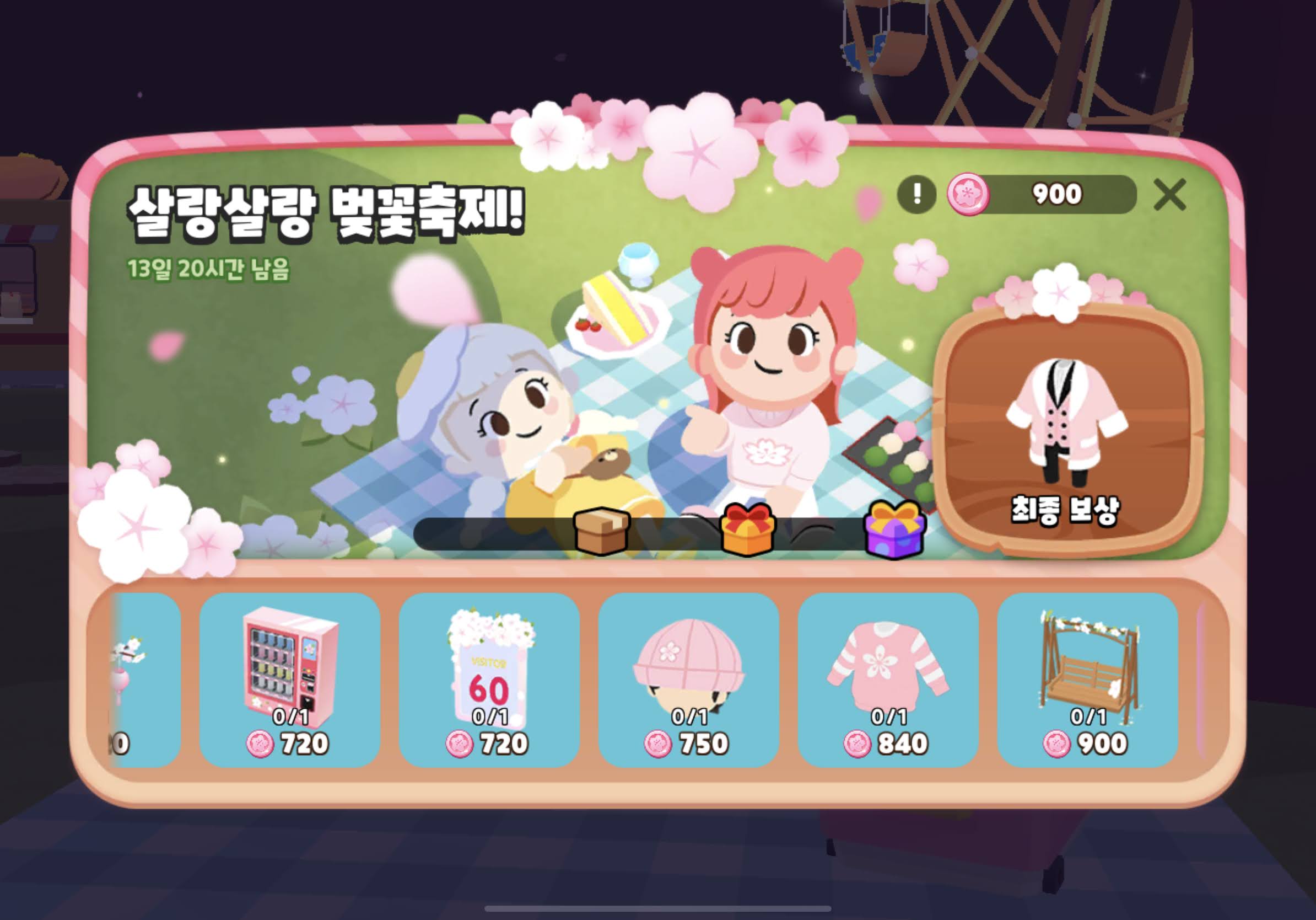 | 학교 식당 반도시 (낮) | 당고/붕어빵/화전 (만들어오기) | 100코인 x 3배 = 300 벚꽃코인 |