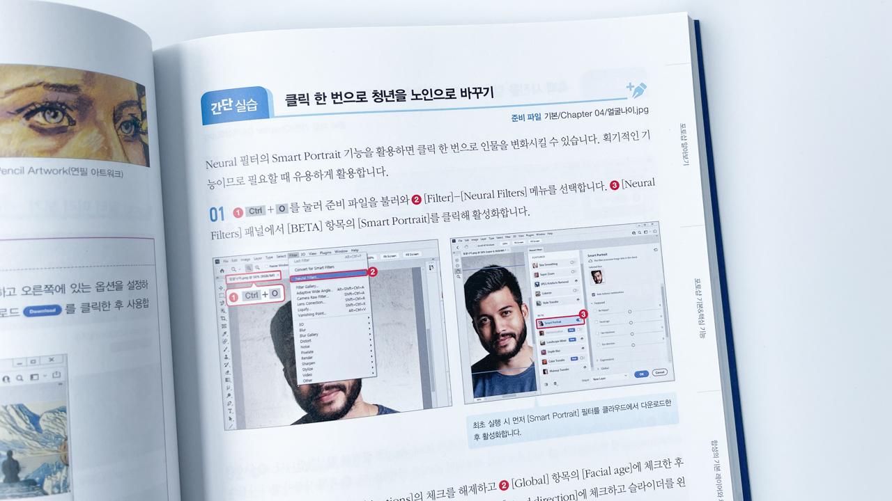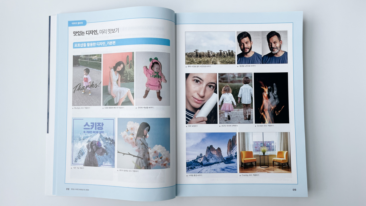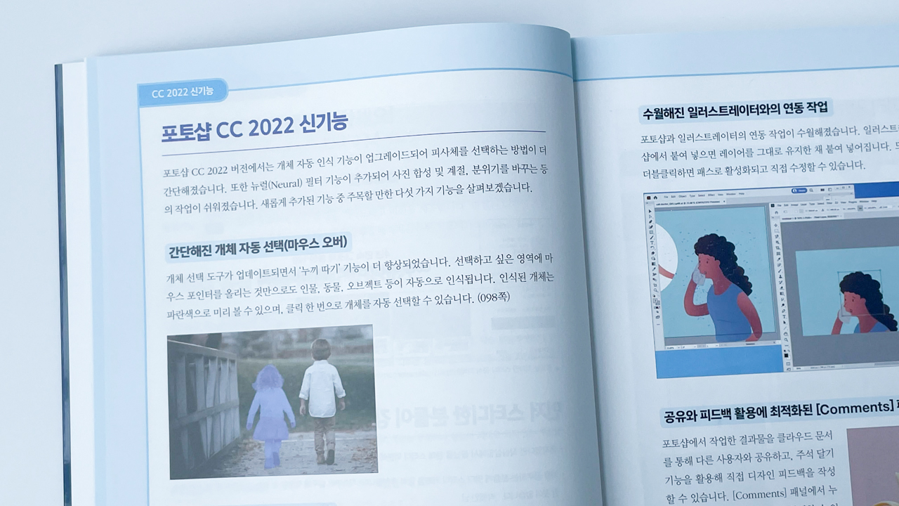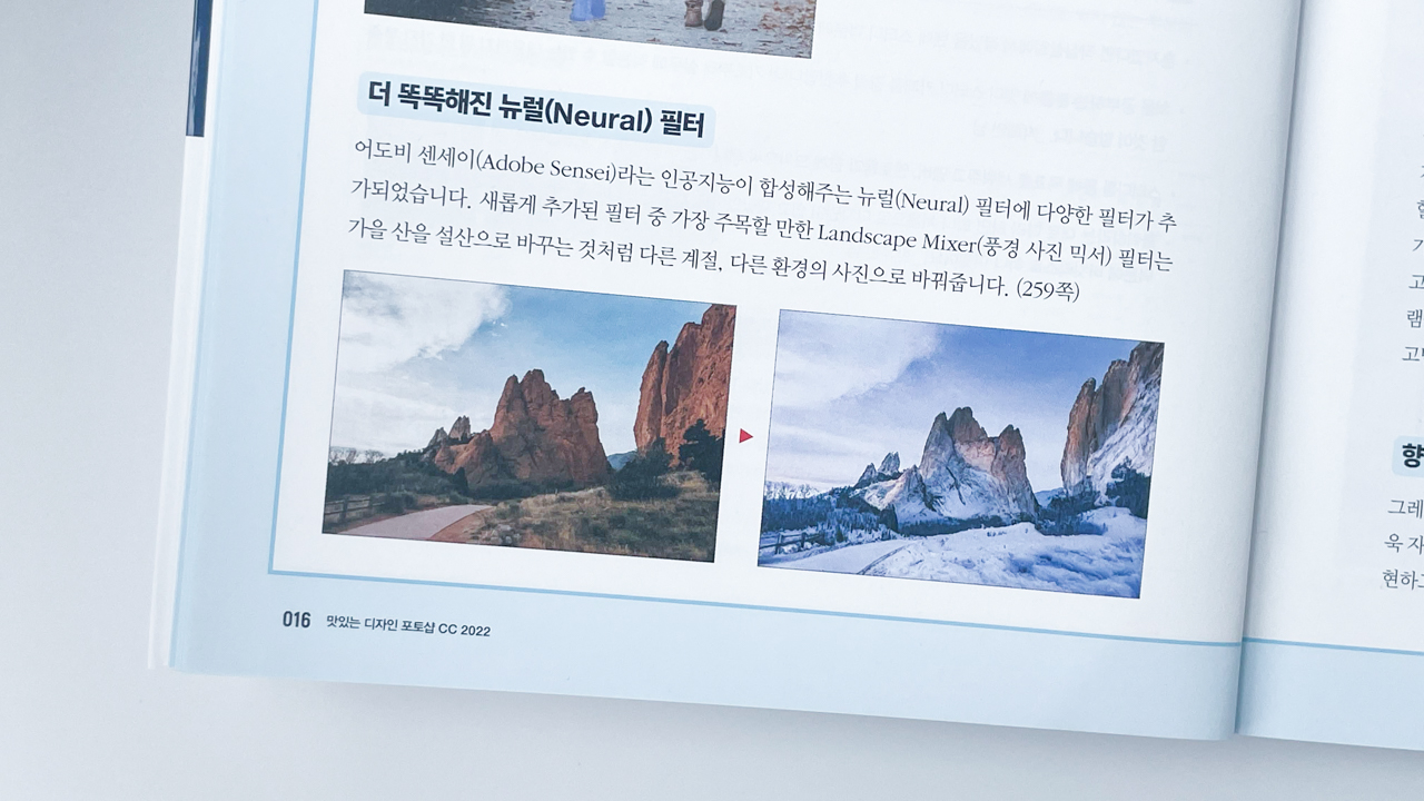 제일 눈여겨 봤던 부분이 포토샵 CC 2022 신기능! 해를 거듭할수록 놀라운 기술들이 많이 나온다. 최신기능 응용편이 책 곳곳에 수록되어 있어 따라해 보는것도 쏠쏠한 재미.