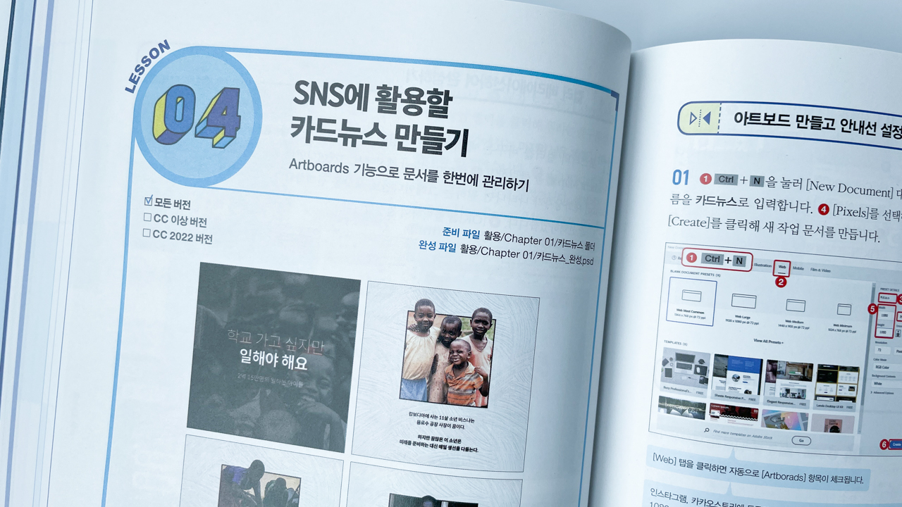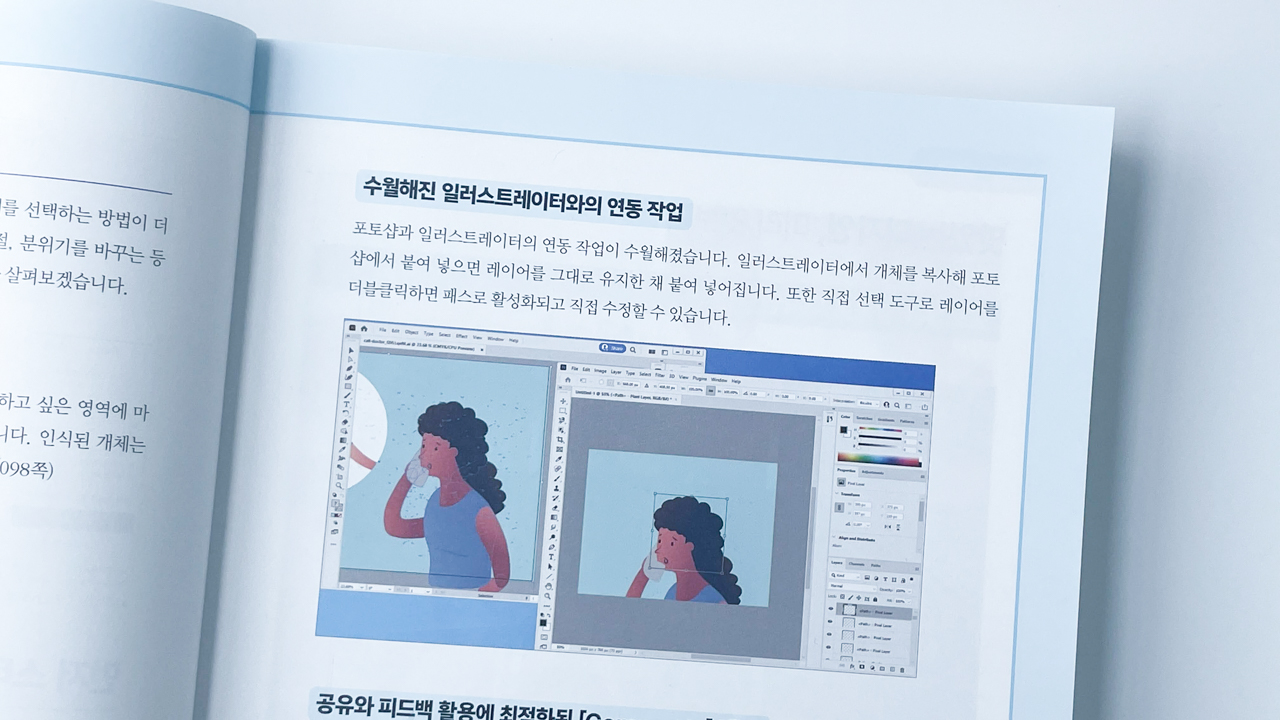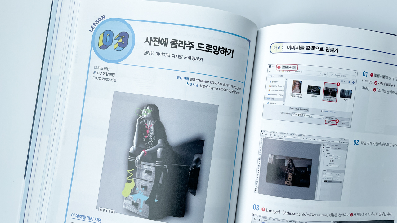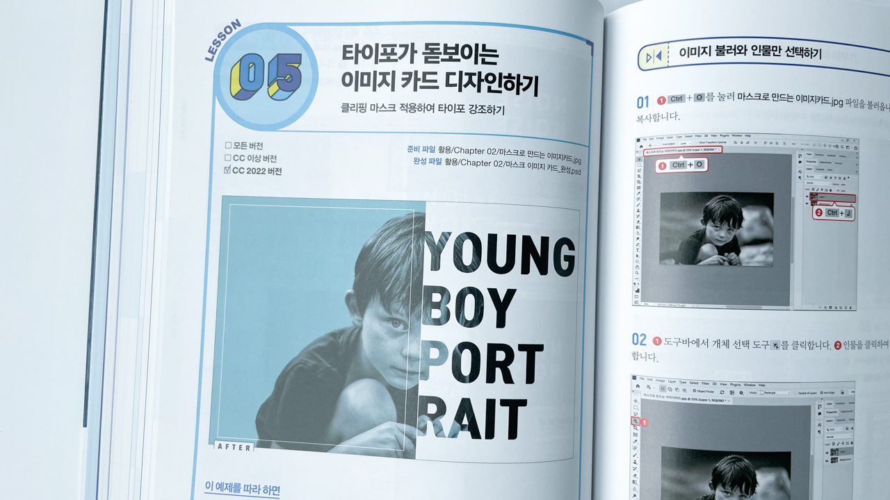 제일 눈여겨 봤던 부분이 포토샵 CC 2022 신기능! 해를 거듭할수록 놀라운 기술들이 많이 나온다. 최신기능 응용편이 책 곳곳에 수록되어 있어 따라해 보는것도 쏠쏠한 재미.
