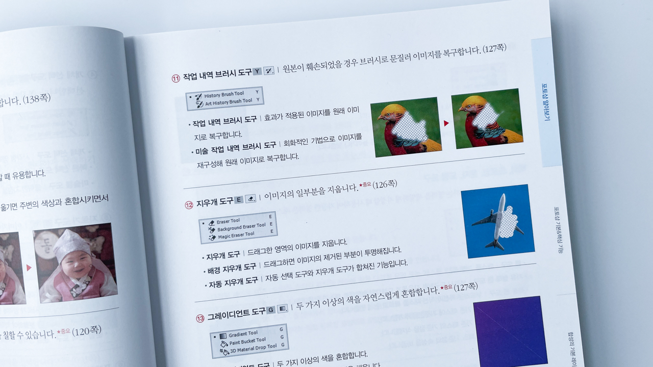 책 초반에 나오는 [포토샵 알아보기] 중, 포토샵 도구 설명에 약간의 이미지 설명을 곁들여두어 더 이해하기 쉽게 되어 있고, [포토샵 기본&핵심기능] 파트 초반에 나와 있는 '먼저 맛보는 포토샵 기본 기능 19가지'를 통해 정말 자주 쓰이는 기본 기능들을 예제를 직접 실습해보면서 배울 수 있는 부분이 정말 매력적이었다. 포토샵 기본기능 19가지만 제대로 할 줄 알면 ! 뒷 예제들은 쉽게 따라할 수 있다 😁