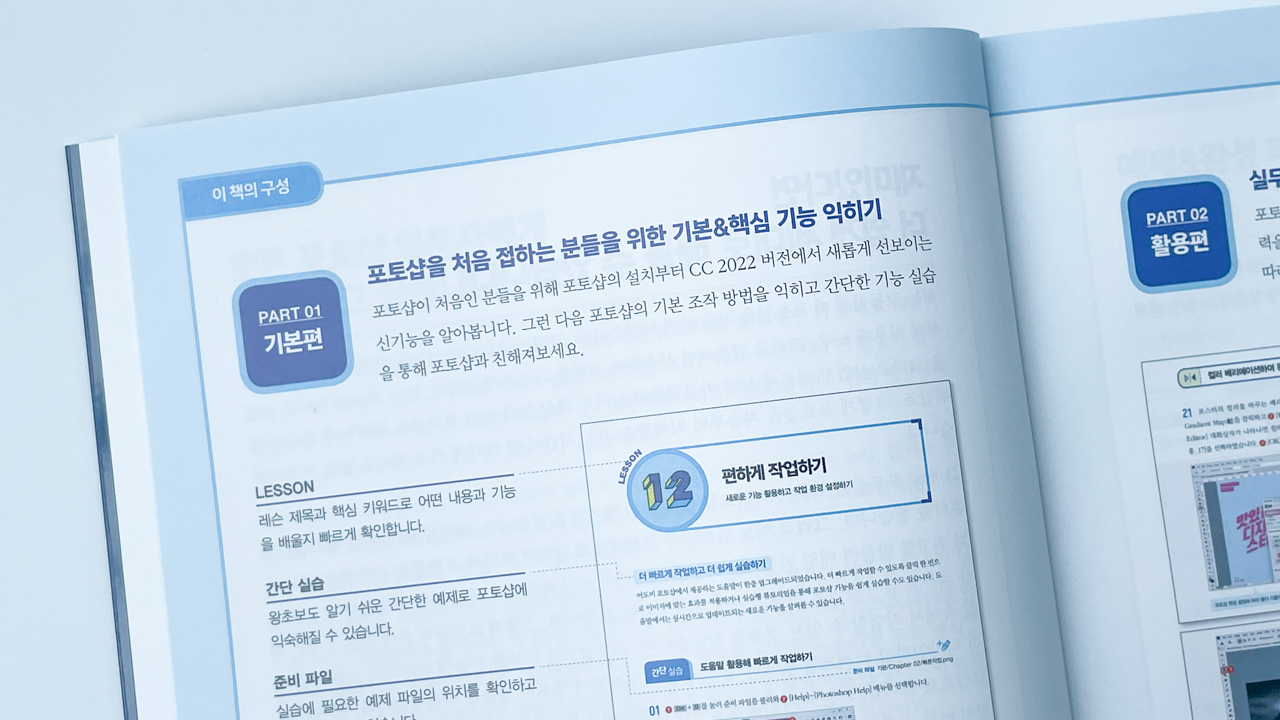 그래픽 디자인의 기본인 포토샵의 기초 기능부터 실무 활용까지 한번에 마스터할 수 있습니다. 기본편에서 핵심 기능을 익히고 활용편에서 실무 예제를 실습하며 포토샵 실력을 업그레이드합