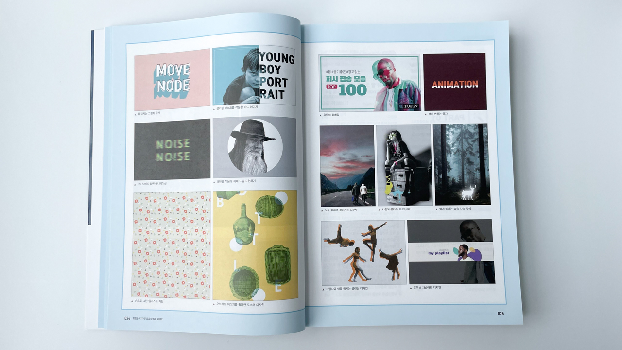 책 앞부분에는 맛있는 디자인 책을 통해 만들어 볼 수 있는 예제 이미지 전체를 확인 가능하다. 이미지 아래 페이지 번호가 쓰여져 있었으면 더 좋았을것 같아 약간 아쉬웠다. 바로 뒤 목차를 통해 찾아보고 예제를 따라 해 볼 수 있다.