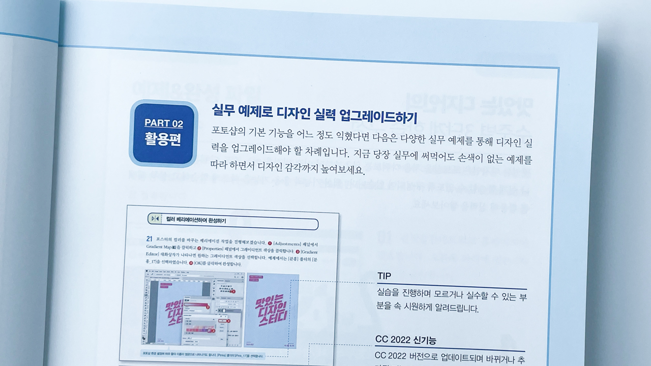 포토샵으로 합성도 하고싶고, 스티커도 만들고싶고, 포스터나 배너도 만들고 싶을땐 맛있는 디자인 포토샵 CC 2022 책을 추천한다. 재미있는 예제를 통해 기초를 배울 수 있고, 요즘 트랜드를 반영한 고급 활용예제를 통해 실무 사용까지 가능하다. 즉, 맛디 포토샵 책은 포토샵 입문자부터 중급 이상의 스킬을 배울 수 있다!