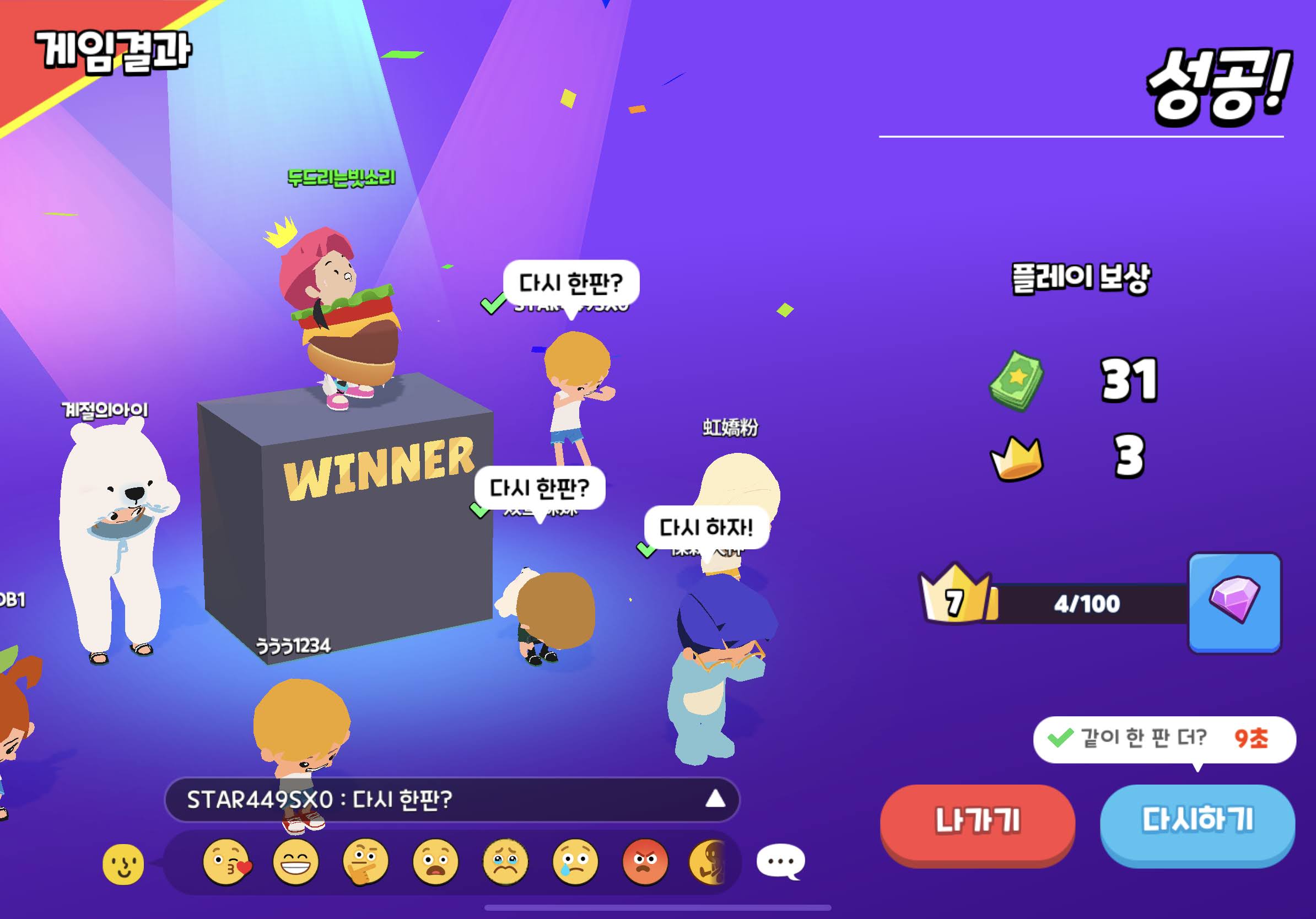| 😗 | 놀람 | 게임파티 얼음절벽달리기 1등 (또는 게임파티 공사장?) 죽지 않고 도착 인것 같기도.. |