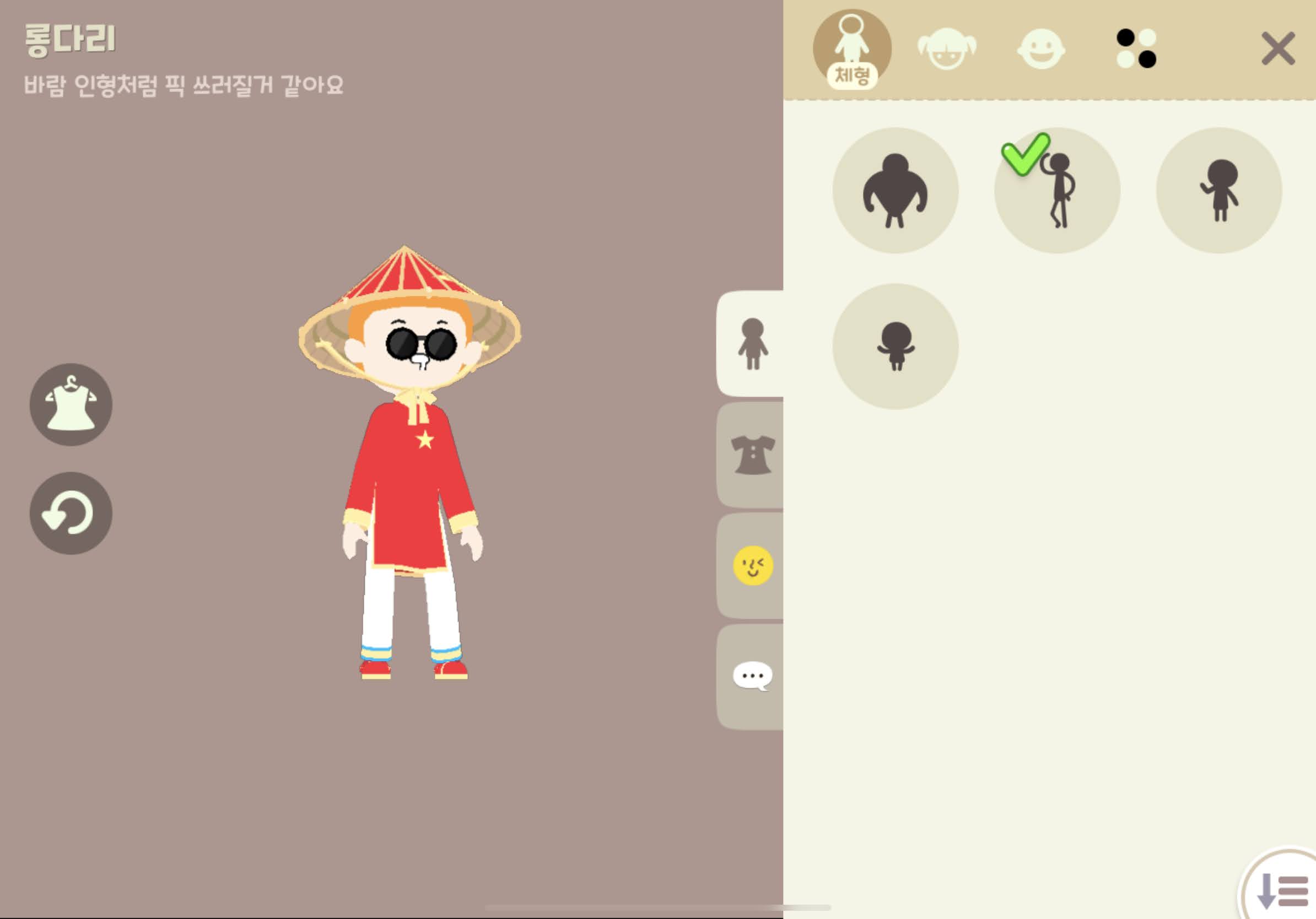 빨강 논라 / 빨강 별 아오자이 2종 / 빨강 꽃신 / 빨강 슬립온 / 빨강 칸동남 / 별 종이 우산으로 총 7가지 코스튬이다.