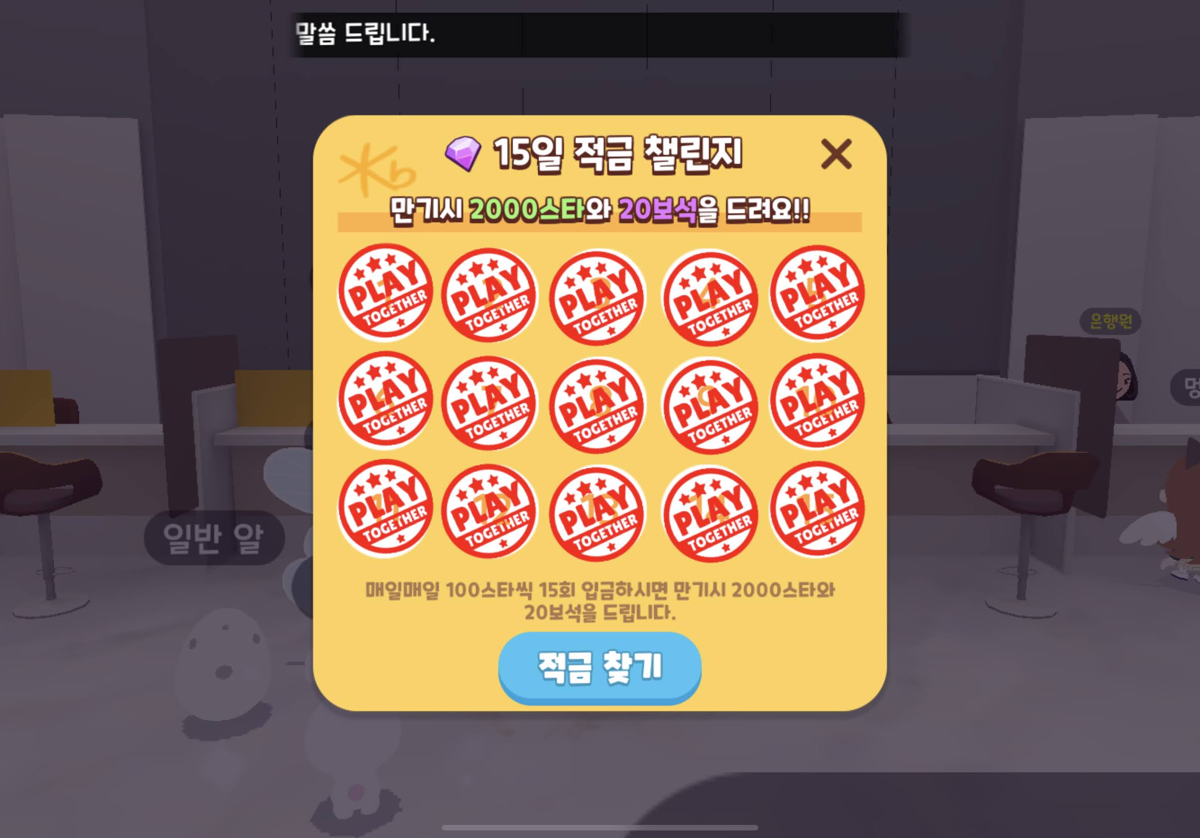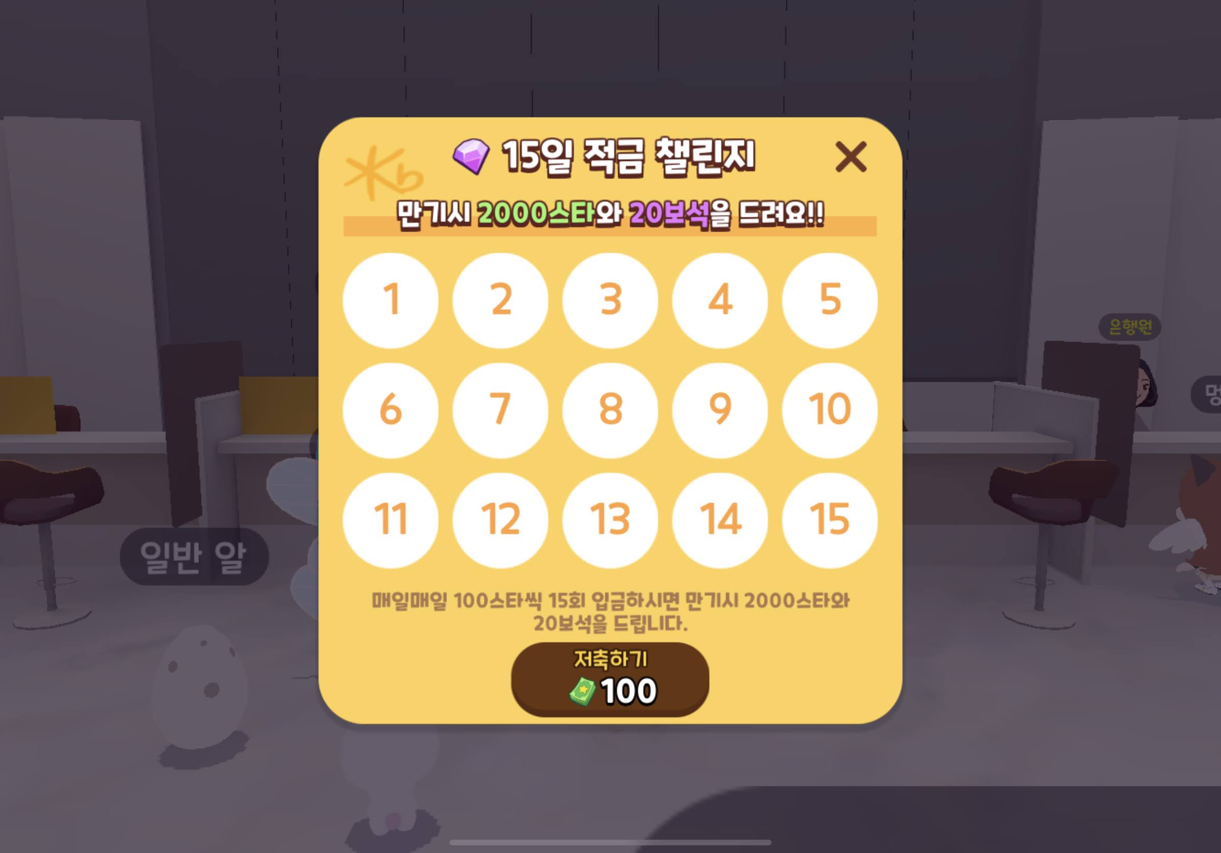 100 스타씩 15일 적립하면 ---> 1500스타 적립금 + 추가500스타 + 추가20다이아를 준다.