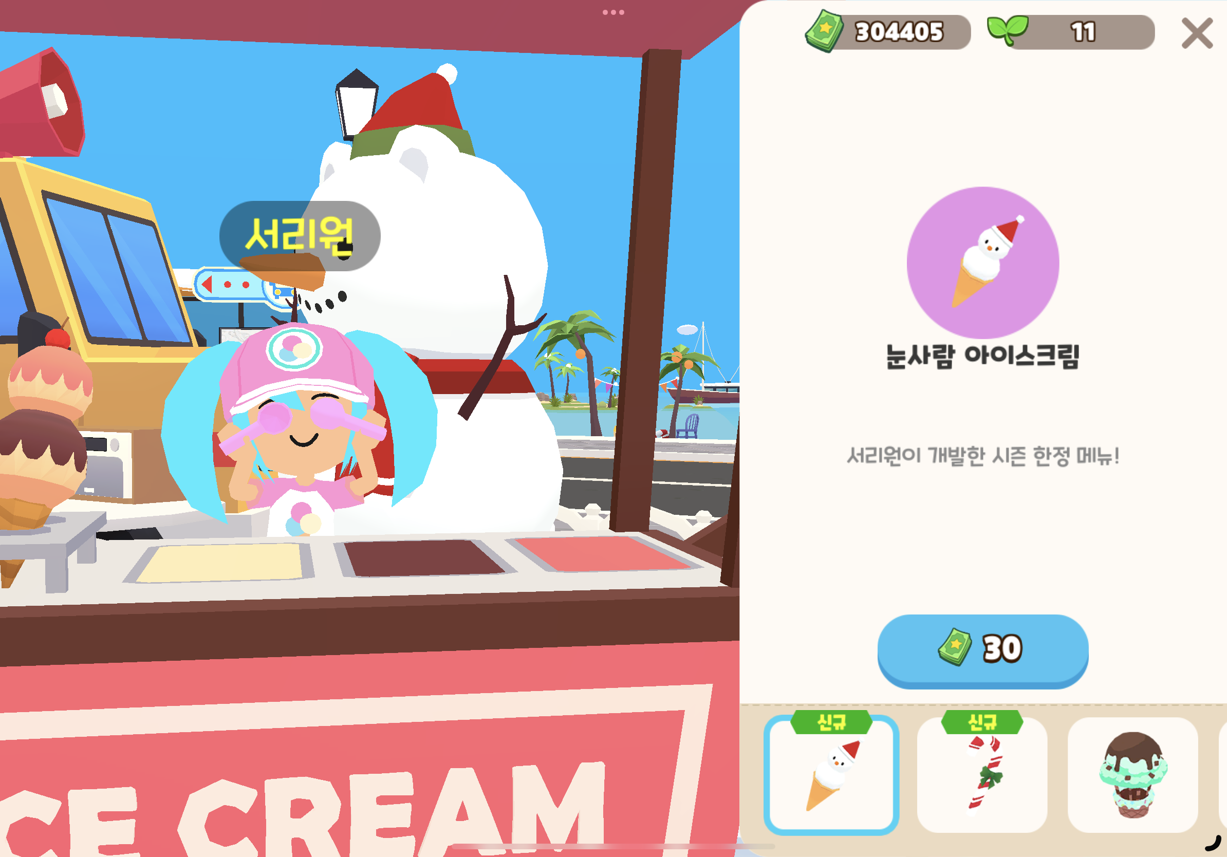 서리원의 눈사람 아이스크림을 먹으면 살 색이 하늘색으로 변한다.