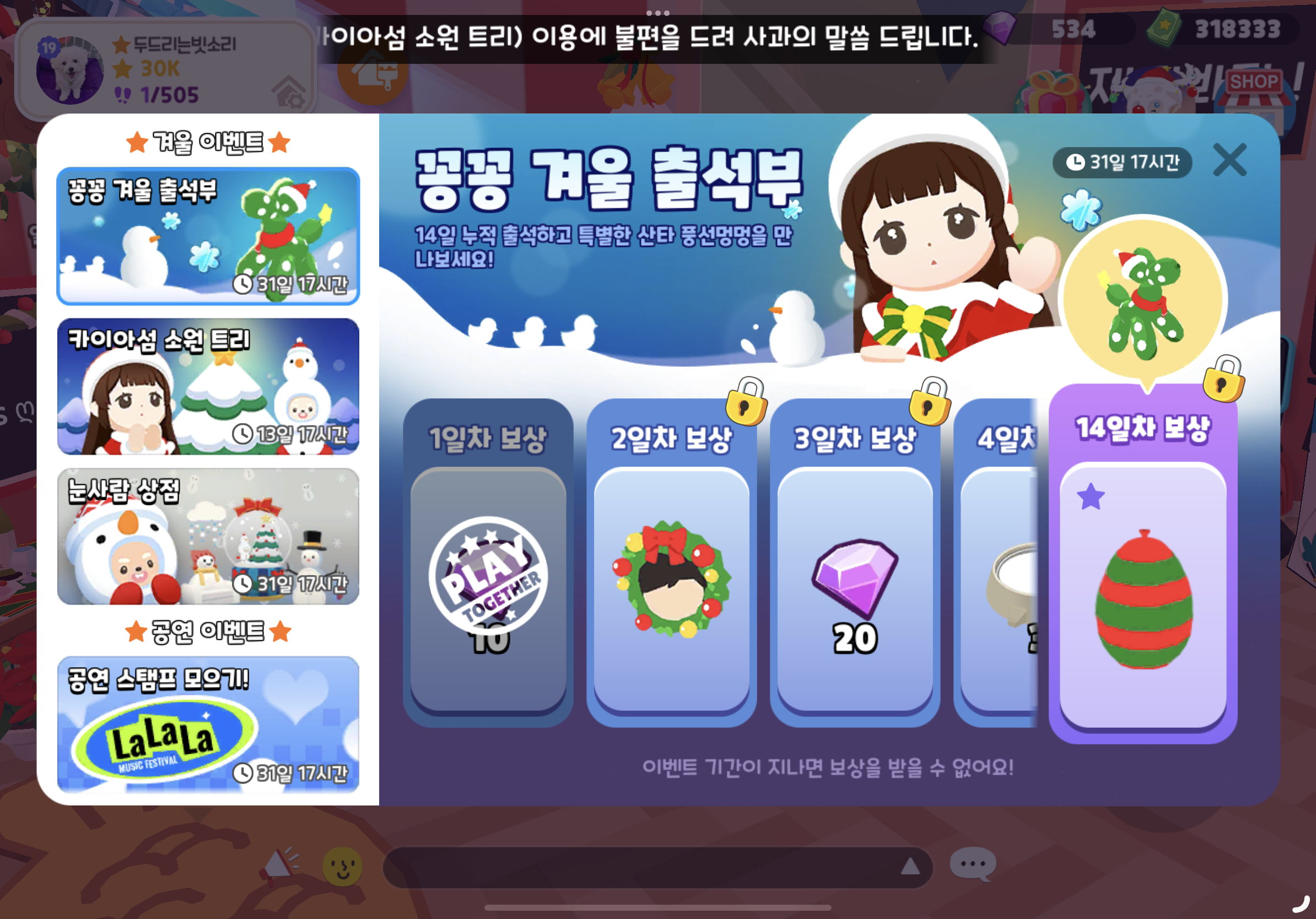 매일 접속보상+이벤트로는 하루에 1500코인 정도 모이고, 꽁꽁 겨울 출석부 출석과 소원트리 오너먼트 1개씩 완성하면 추가로 주는게 조금 있어서.. 눈꽃코인이 쏠쏠하게 들어온다 😊
