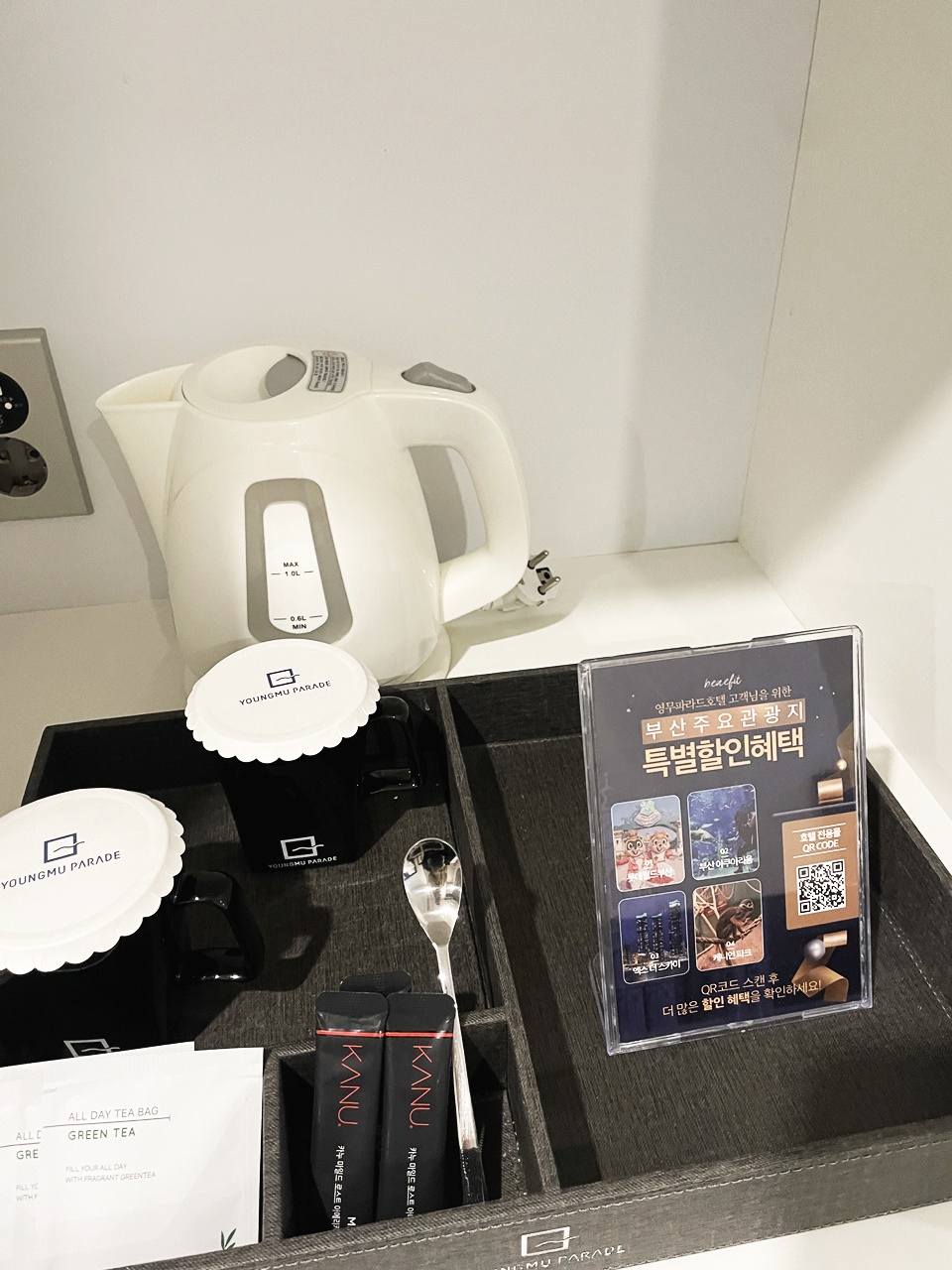 컵두개, 녹차두세개, 카누 두세개. 그리고 전기포트가 있는데 (전기포트는 내부가 녹슬어서 못썼습니다 ㅜㅜ)