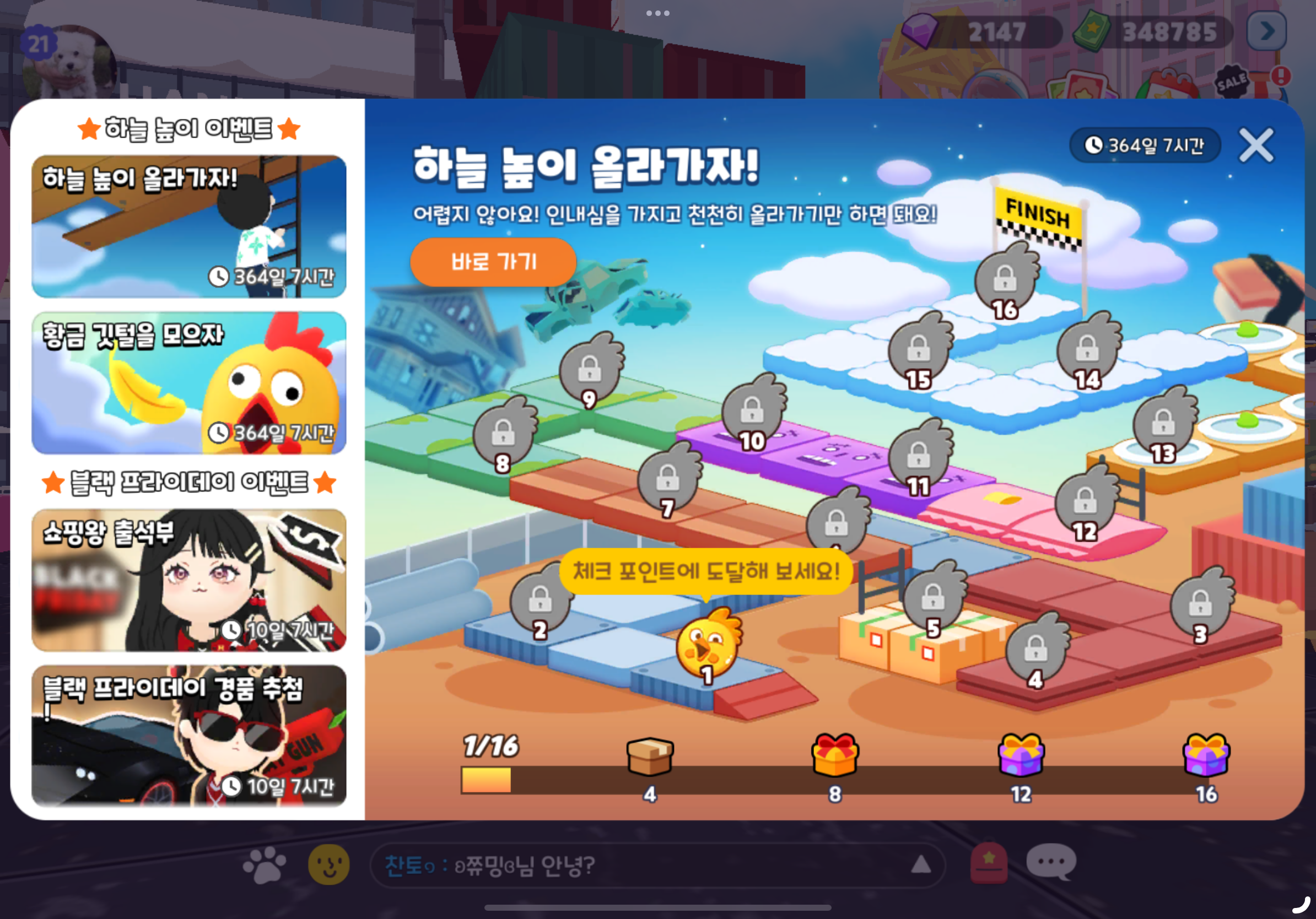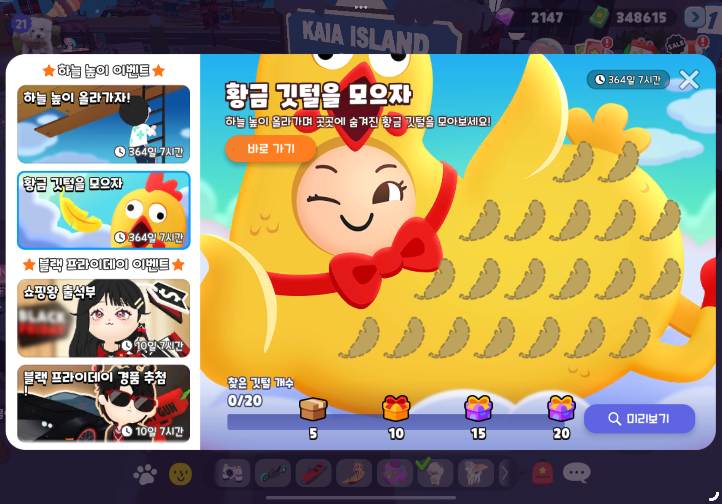 참. 하늘 높이 올라가자! 이벤트를 하면서 황금 깃털을 모으자 이벤트를 같이 진행해야 한다.