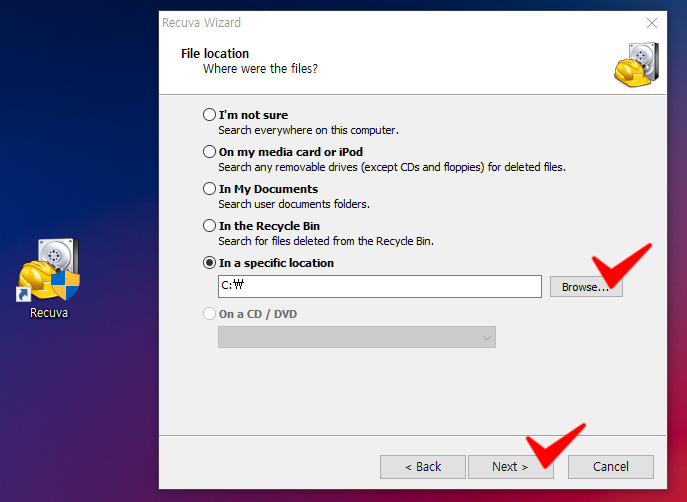 어디서 파일을 잃어버린지 잘 모르겠으면 젤 위 있는 [ I'm not sure ]에 체크. 문제가 생긴 부분을 알고있다면 스페셜 로케이션 지정을 해 줍니다.