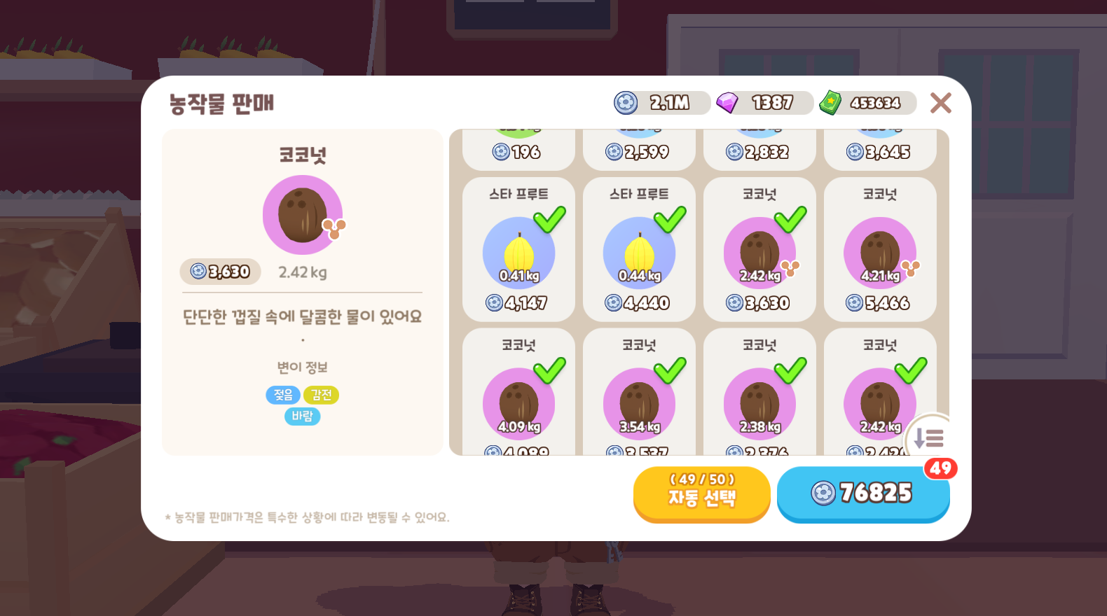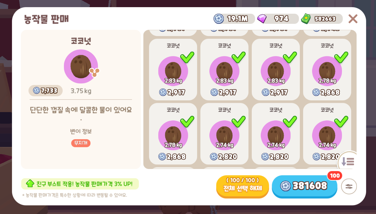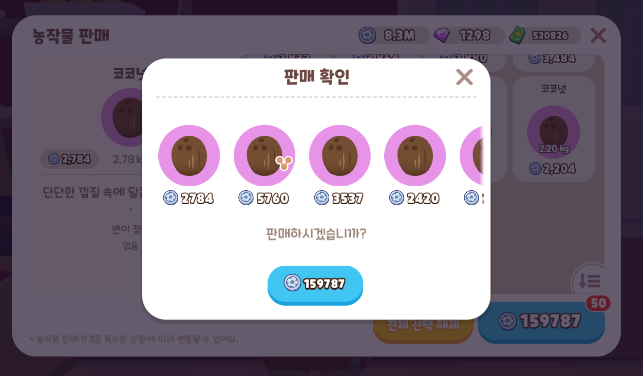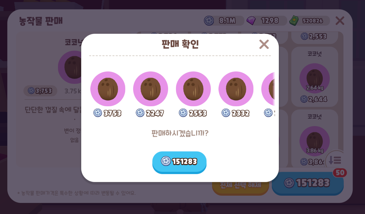위 이미지처럼 178개를 수확했을 경우, 코코넛만으로 607,043 코인이 순식간에 만들어진다.